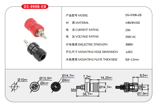 英文描述:Binding Post Terminal Connectors,20A,Outer Screw(M4), Red