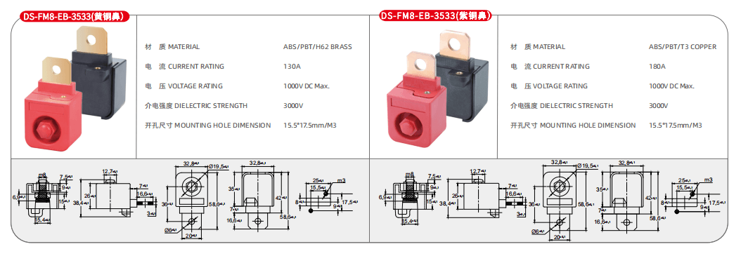 英文描述:Feed Through Junction Blocks, 130A,Outer Screw(M8), Red