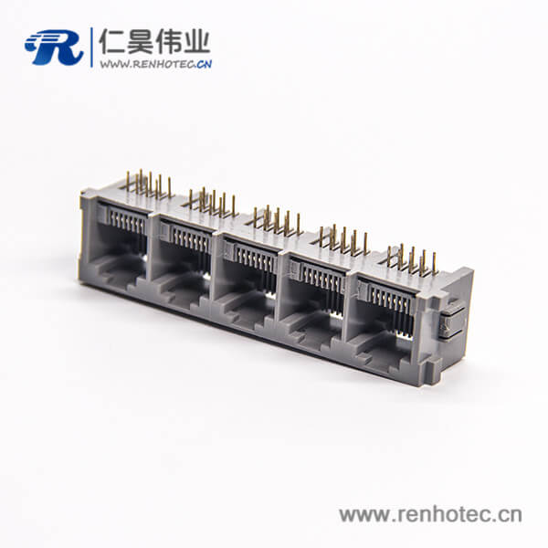 标签:RJ45插座,8P8C,5端口,1*5,弯式90°,触头镀金,插孔,PCB板安装,不带屏蔽,不带灯,不带滤波