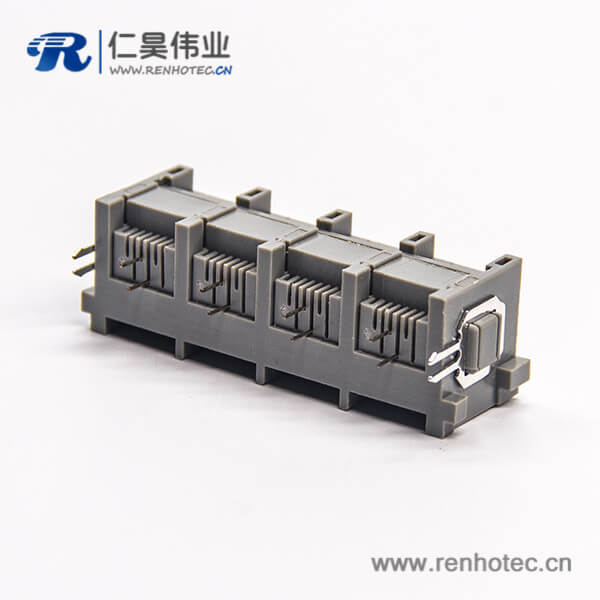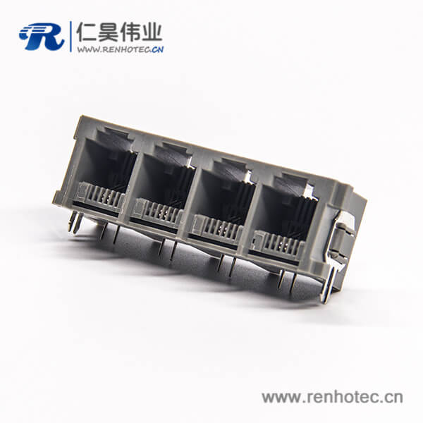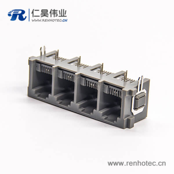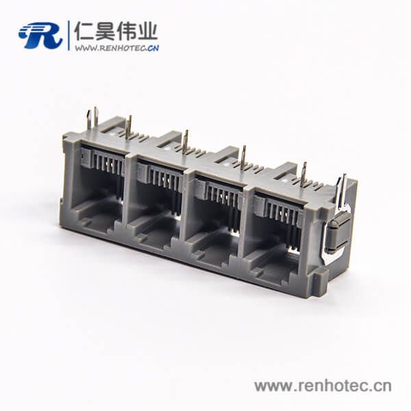 标签:RJ11插座,6P2C,4端口,1*4,弯式90°,触头镀金,插孔,PCB板安装,不带屏蔽,不带灯,不带滤波